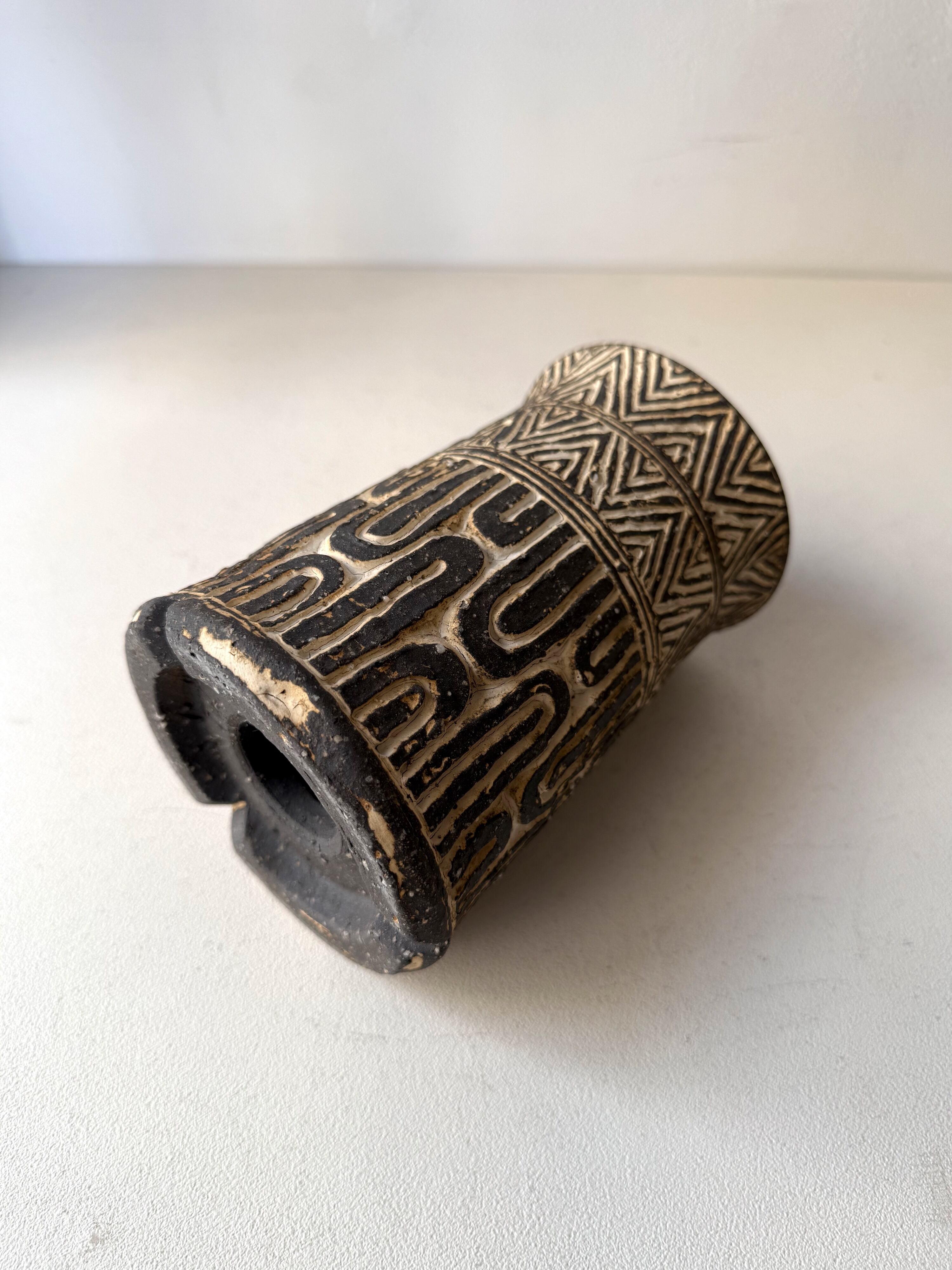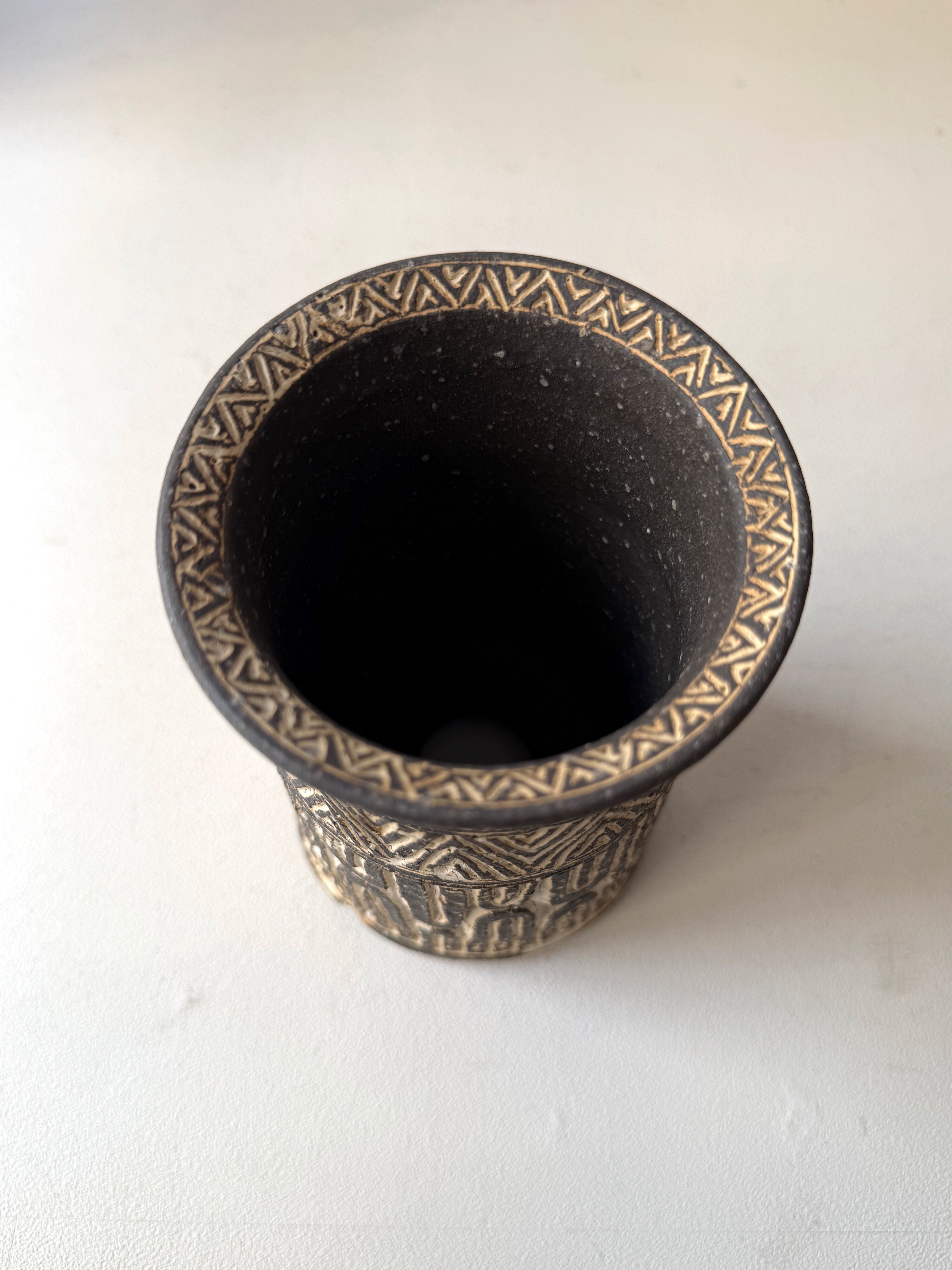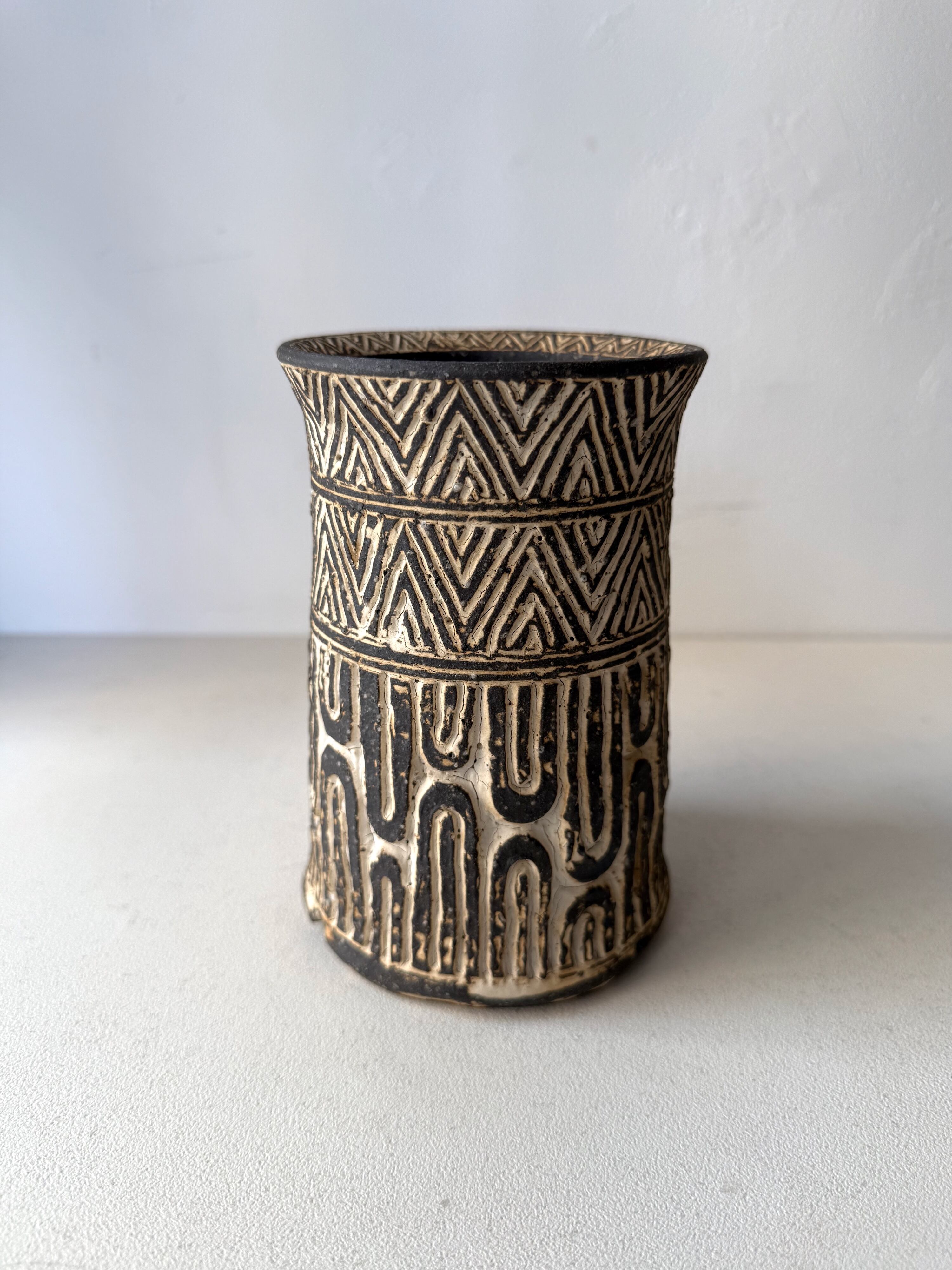プリミティブな文様を中心としたオリジナルの「刻文」の植木鉢や花器、生活の中で生きる器のほか、